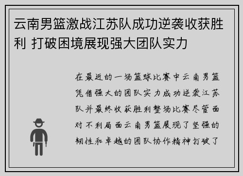 云南男篮激战江苏队成功逆袭收获胜利 打破困境展现强大团队实力