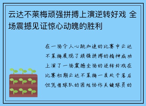 云达不莱梅顽强拼搏上演逆转好戏 全场震撼见证惊心动魄的胜利