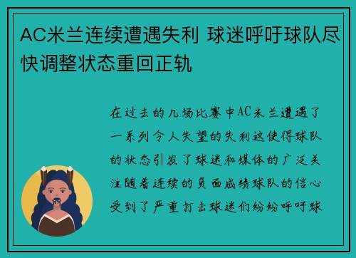 AC米兰连续遭遇失利 球迷呼吁球队尽快调整状态重回正轨