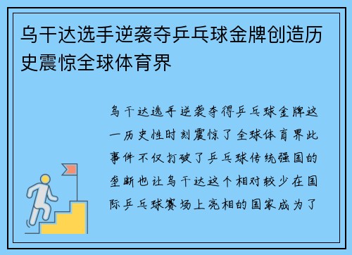乌干达选手逆袭夺乒乓球金牌创造历史震惊全球体育界