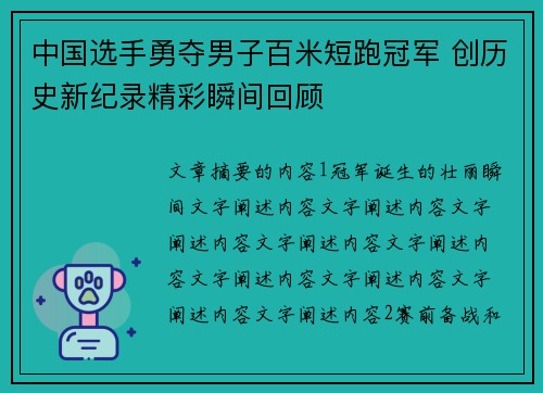 中国选手勇夺男子百米短跑冠军 创历史新纪录精彩瞬间回顾