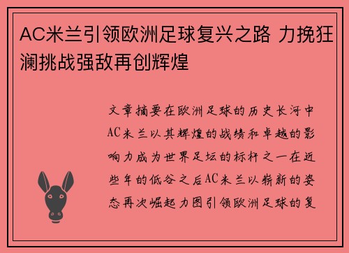 AC米兰引领欧洲足球复兴之路 力挽狂澜挑战强敌再创辉煌