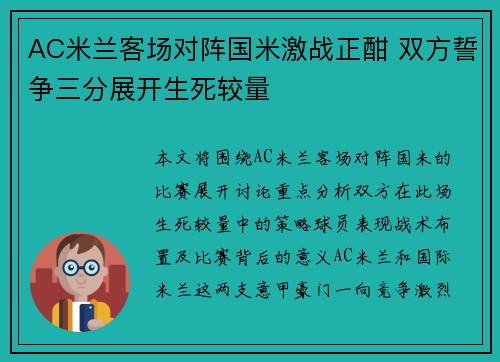 本文将围绕AC米兰客场对阵国米的比赛展开讨论,重点分析双方在此场生死较量中的策略、球员表现、战术布置及比赛背后的意义。AC米兰和国际米兰这两支意甲豪门一向竞争激烈,此次相遇不仅关乎意甲冠军的争夺,更关乎荣誉与未来的发展。比赛的胜负将直接影响...
