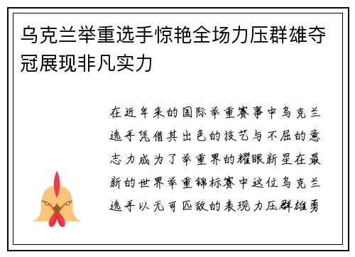 乌克兰举重选手惊艳全场力压群雄夺冠展现非凡实力