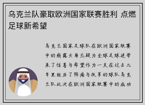 乌克兰队豪取欧洲国家联赛胜利 点燃足球新希望