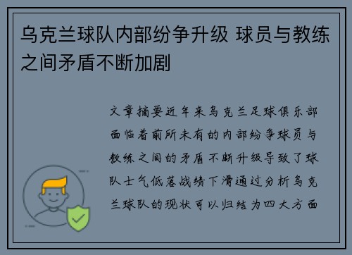 乌克兰球队内部纷争升级 球员与教练之间矛盾不断加剧