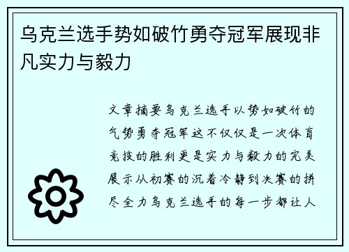 乌克兰选手势如破竹勇夺冠军展现非凡实力与毅力