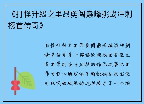 《打怪升级之里昂勇闯巅峰挑战冲刺榜首传奇》