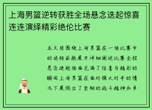 上海男篮逆转获胜全场悬念迭起惊喜连连演绎精彩绝伦比赛