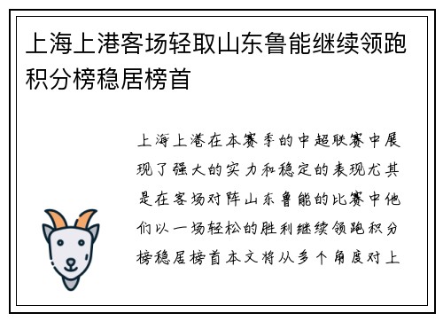 上海上港在本赛季的中超联赛中,展现了强大的实力和稳定的表现,尤其是在客场对阵山东鲁能的比赛中,他们以一场轻松的胜利继续领跑积分榜,稳居榜首。本文将从多个角度对上海上港的这场胜利进行详细分析,探讨他们在比赛中的表现如何帮助他们稳居联赛榜首。首...