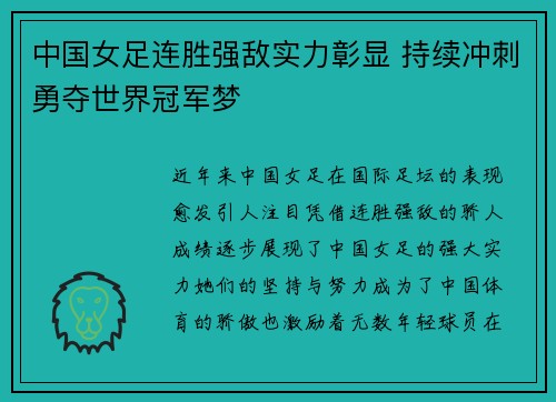 中国女足连胜强敌实力彰显 持续冲刺勇夺世界冠军梦