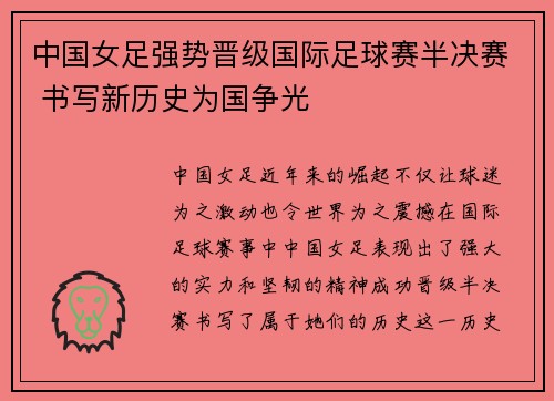 中国女足强势晋级国际足球赛半决赛 书写新历史为国争光