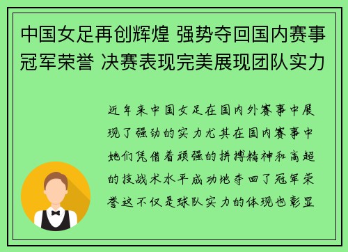 中国女足再创辉煌 强势夺回国内赛事冠军荣誉 决赛表现完美展现团队实力