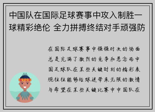 中国队在国际足球赛事中攻入制胜一球精彩绝伦 全力拼搏终结对手顽强防线