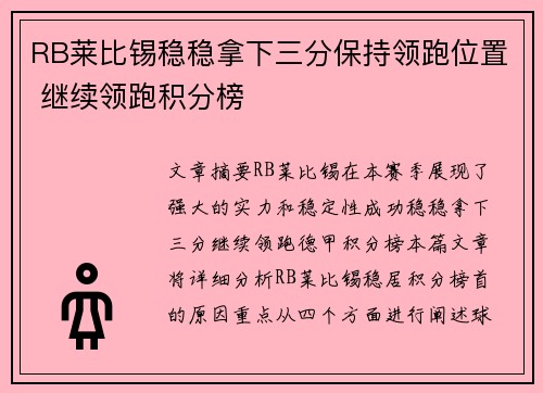 文章摘要:RB莱比锡在本赛季展现了强大的实力和稳定性,成功稳稳拿下三分,继续领跑德甲积分榜。本篇文章将详细分析RB莱比锡稳居积分榜首的原因,重点从四个方面进行阐述:球队的整体战术安排与执行、关键球员的突出表现、球队深厚的板凳深度以及强大的主...