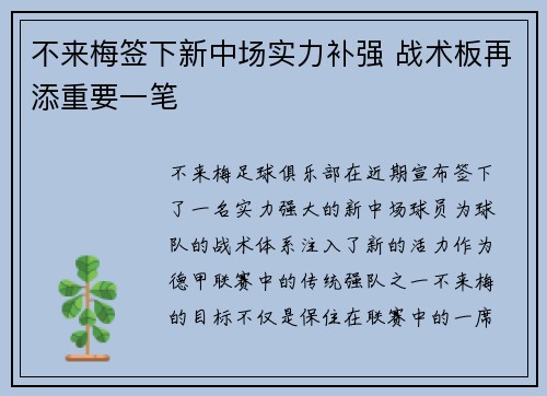 不来梅签下新中场实力补强 战术板再添重要一笔