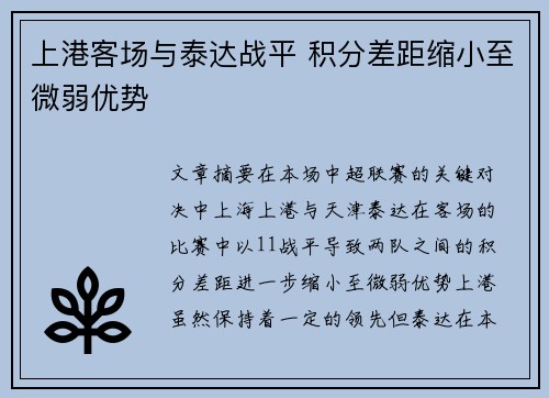 上港客场与泰达战平 积分差距缩小至微弱优势