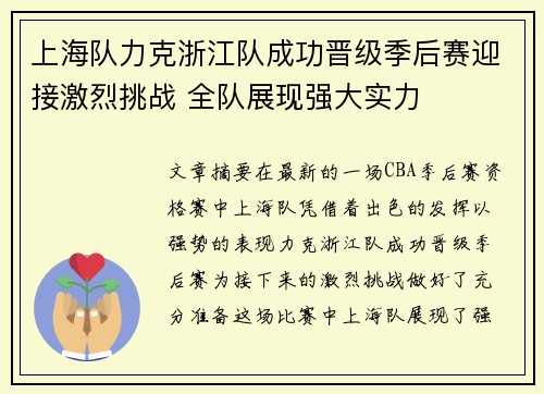 上海队力克浙江队成功晋级季后赛迎接激烈挑战 全队展现强大实力
