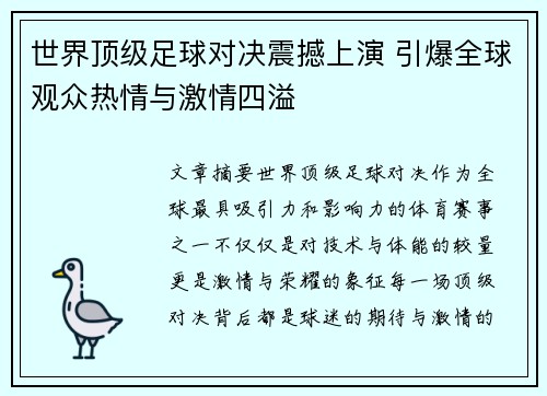 世界顶级足球对决震撼上演 引爆全球观众热情与激情四溢