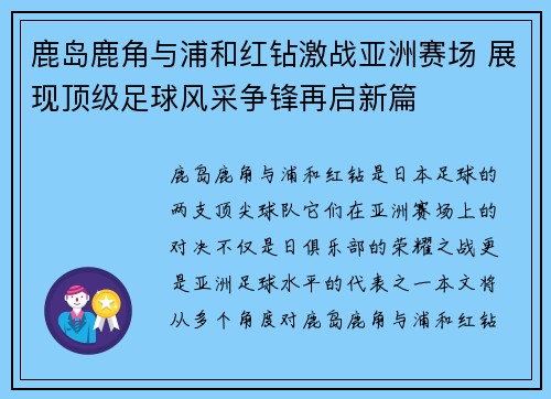 鹿岛鹿角与浦和红钻激战亚洲赛场 展现顶级足球风采争锋再启新篇