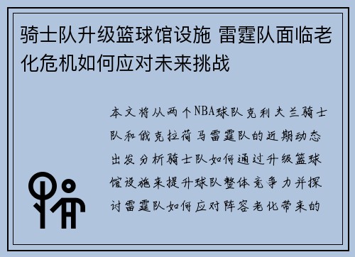 本文将从两个NBA球队——克利夫兰骑士队和俄克拉荷马雷霆队的近期动态出发,分析骑士队如何通过升级篮球馆设施来提升球队整体竞争力,并探讨雷霆队如何应对阵容老化带来的未来挑战。文章首先对骑士队在提升球馆设施方面的努力进行详细阐述,探讨这一举措如...