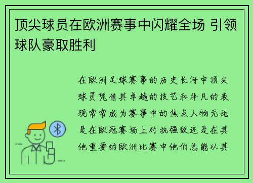 顶尖球员在欧洲赛事中闪耀全场 引领球队豪取胜利