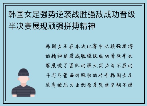 韩国女足强势逆袭战胜强敌成功晋级半决赛展现顽强拼搏精神