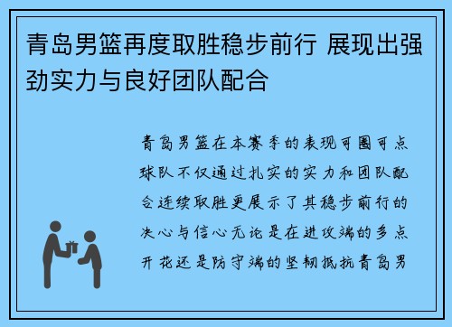 青岛男篮再度取胜稳步前行 展现出强劲实力与良好团队配合