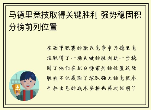 马德里竞技取得关键胜利 强势稳固积分榜前列位置
