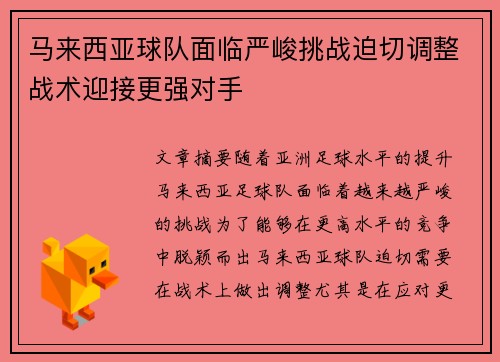 文章摘要:随着亚洲足球水平的提升,马来西亚足球队面临着越来越严峻的挑战。为了能够在更高水平的竞争中脱颖而出,马来西亚球队迫切需要在战术上做出调整,尤其是在应对更强对手时。本文将从四个方面详细探讨马来西亚球队在面对更强对手时所面临的挑战,以及...