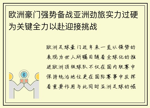 欧洲豪门强势备战亚洲劲旅实力过硬为关键全力以赴迎接挑战