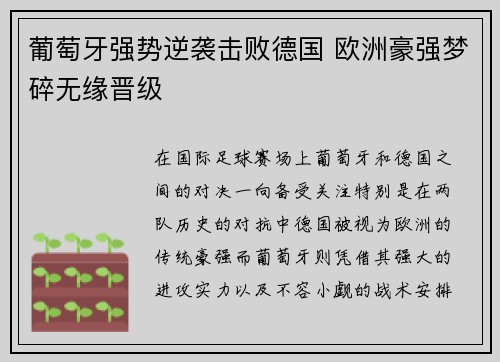 葡萄牙强势逆袭击败德国 欧洲豪强梦碎无缘晋级