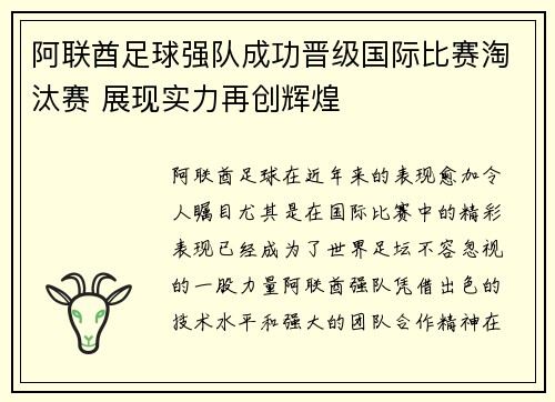 阿联酋足球强队成功晋级国际比赛淘汰赛 展现实力再创辉煌