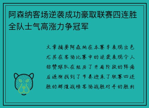 阿森纳客场逆袭成功豪取联赛四连胜全队士气高涨力争冠军