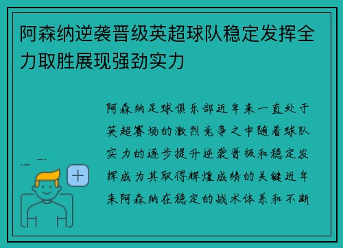 阿森纳逆袭晋级英超球队稳定发挥全力取胜展现强劲实力