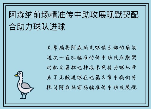 文章摘要:阿森纳足球俱乐部的前场进攻一直以精准的传中助攻和默契的配合著称,这种战术风格为球队带来了无数进球。在这篇文章中,我们将探讨阿森纳前场精准传中助攻展现默契配合的多种方式及其对球队进攻表现的影响。文章将从四个方面进行详细阐述:一是传中...
