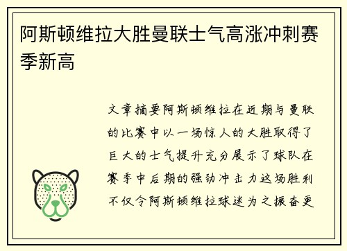 阿斯顿维拉大胜曼联士气高涨冲刺赛季新高