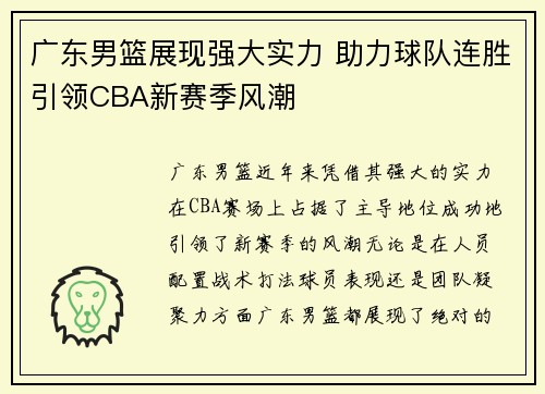 广东男篮展现强大实力 助力球队连胜引领CBA新赛季风潮