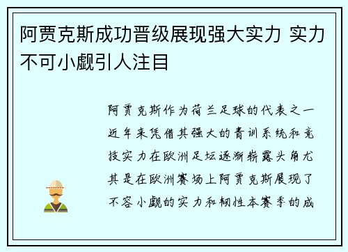 阿贾克斯成功晋级展现强大实力 实力不可小觑引人注目