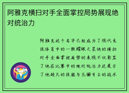 阿雅克横扫对手全面掌控局势展现绝对统治力