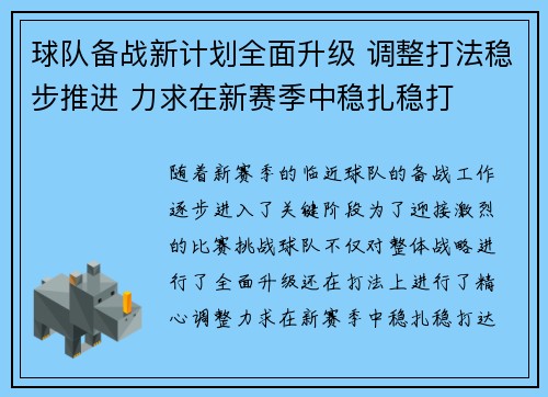 球队备战新计划全面升级 调整打法稳步推进 力求在新赛季中稳扎稳打