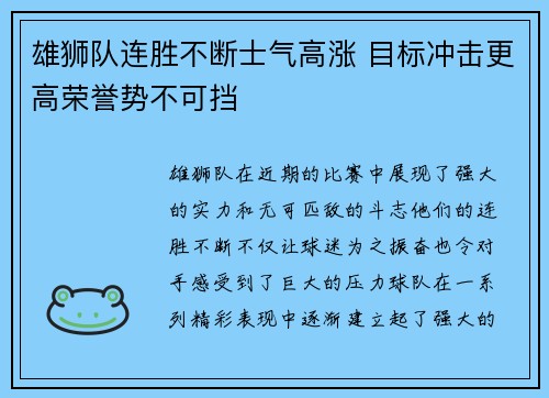 雄狮队连胜不断士气高涨 目标冲击更高荣誉势不可挡