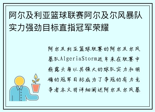 阿尔及利亚篮球联赛的阿尔及尔风暴队(Algeria Storm)近年来在联赛中崭露头角,以其强大的球队实力和明确的冠军目标,成为了争冠的有力竞争者。本文将详细阐述阿尔及尔风暴队的雄厚实力,并分析其为什么能够目标直指冠军荣耀。文章将从球队的阵...