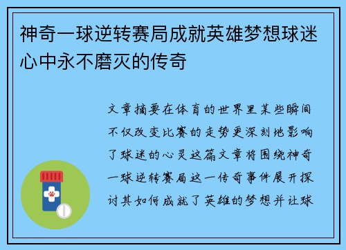 文章摘要:在体育的世界里,某些瞬间不仅改变比赛的走势,更深刻地影响了球迷的心灵。这篇文章将围绕“神奇一球逆转赛局”这一传奇事件展开,探讨其如何成就了英雄的梦想,并让球迷的记忆永不磨灭。文章将从四个方面详细阐述这一传奇:首先,从球员的个人努力...