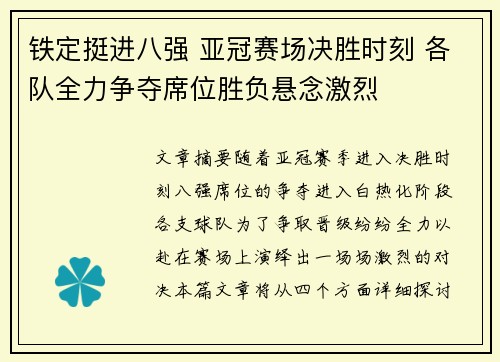文章摘要:随着亚冠赛季进入决胜时刻,八强席位的争夺进入白热化阶段。各支球队为了争取晋级,纷纷全力以赴,在赛场上演绎出一场场激烈的对决。本篇文章将从四个方面详细探讨铁定挺进八强的背景和各队在亚冠赛场上全力争夺席位的情形。首先,文章将分析目前的...
