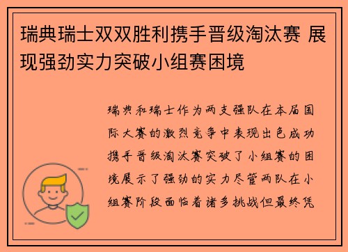 瑞典瑞士双双胜利携手晋级淘汰赛 展现强劲实力突破小组赛困境