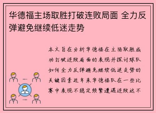 本文旨在分析华德福在主场取胜,成功打破连败局面的表现,并探讨球队如何全力反弹,避免继续低迷走势的关键因素。近年来,华德福队在一些比赛中表现不稳定,频繁遭遇连败,这不仅影响了球队士气,也让球迷的期待逐渐降低。然而,华德福通过一场主场胜利成功打...
