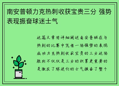 这篇文章将详细阐述南安普顿在与热刺的比赛中,凭借一场强势的表现成功力克热刺,收获宝贵的三分。这场胜利不仅仅是三分的积累,更重要的是激发了球迷们的士气,振奋了整个球队的精神状态。文章将从四个方面进行详细分析:首先,从比赛本身的表现来看,南安普...