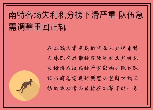 在本篇文章中,我们将深入分析南特足球队在近期的客场失利及其对积分榜排名造成的严重影响,并探讨队伍当前急需进行调整以重新回到正轨的迫切情况。南特在本赛季的一系列客场比赛中表现不尽如人意,这使得他们的积分排名出现了显著下滑。队伍目前处于危机中,...