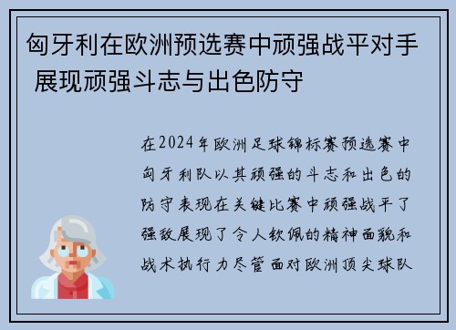 匈牙利在欧洲预选赛中顽强战平对手 展现顽强斗志与出色防守